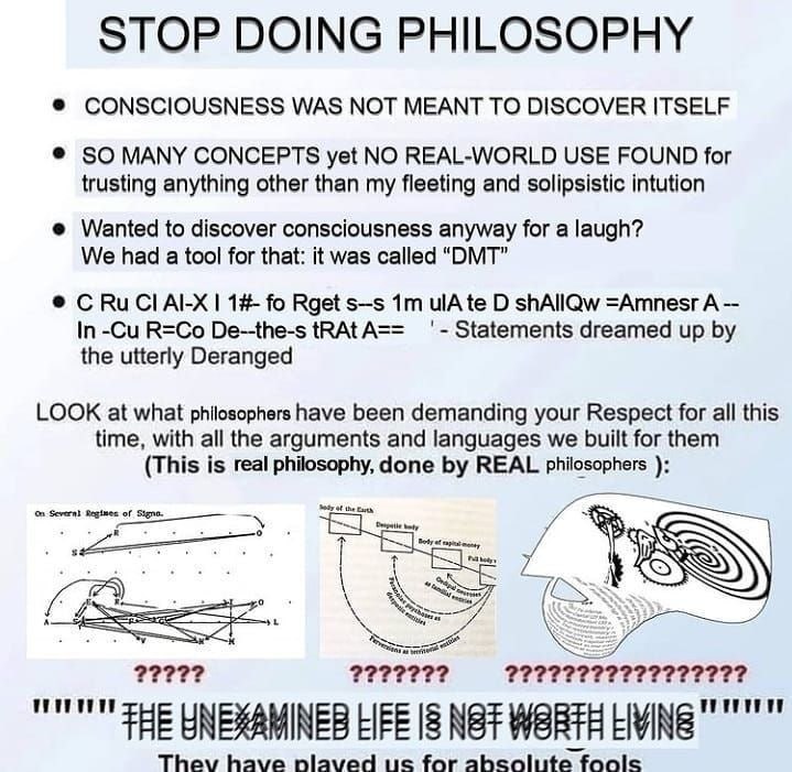 STOP DOING PHILOSOPHY. Consciousness was not meant to discover itself. So many concepts yet no real-world use found for trusting anything other than my fleeting and solipsistic intuition. Wanted to discover consciousness anyway for a laugh? We had a tool for that: it was called "DMT". C Ru CI AI-X I 1#- fo Rget s-s 1m uLA te D shAllQw =Amnesr A-- In -Cu R=Co De--the-s tRAt A== '- Statements dreamed up by the utterly Deranged. LOOK at what philosophers have been demanding your Respect for all this time, with all the arguments and languages we built for them (This is real philosophy, done by REAL philosophers). ?????. ????????. ??????????????????. """"""" THE UNEXAMINED LIFE IS NOT WORTH LIVING """""" They have played us for absolute fools.