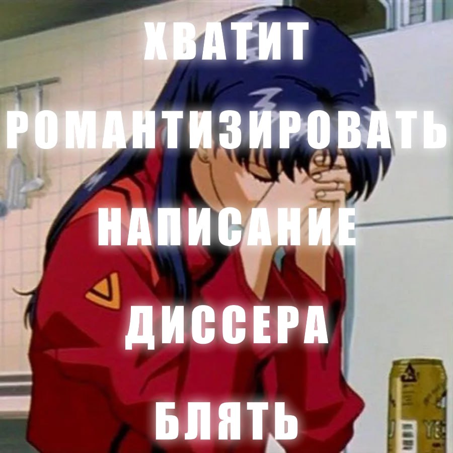 На изображении показана героиня аниме Мисато Кацураги в красной куртке, которая сидит, закрыв лицо одной рукой, выражая усталость или отчаяние. Рядом с ней на полу стоит банка с напитком. Надпись на меме, «Хватит романтизировать написание диссера, блять», отражает распространённое чувство фрустрации и разочарования, связанное с длительным и изнурительным процессом написания диссертации, а также подчёркивает, что этот процесс далёк от идеализированного представления о научной работе. Люди могут искать этот мем по запросам, связанным с написанием диссертации, усталостью, или фразами, касающимися реализма в академической среде, особенно используя русский текст мема.