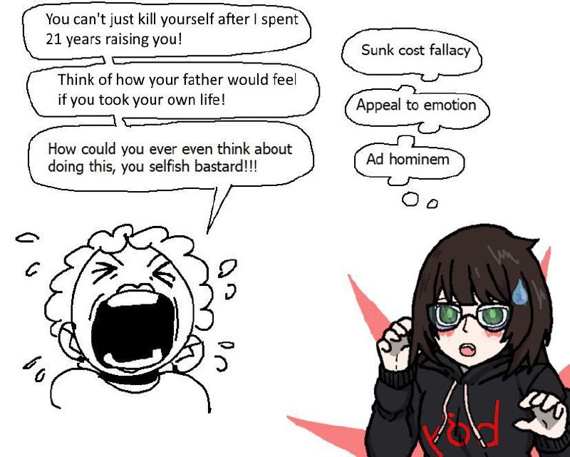 You can't just kill yourself after I spent 21 years raising you! Think of how your father would feel if you took your own life! How could you ever even think about doing this, you selfish bastard!!! Sunk cost fallacy. Appeal to emotion. Ad hominem.