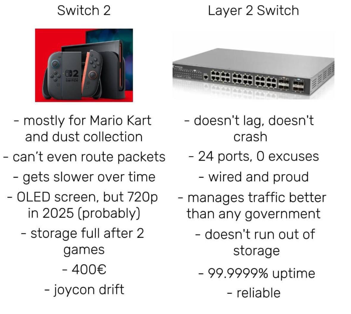 Switch 2. Layer 2 Switch. Mostly for Mario Kart and dust collection. Doesn't lag, doesn't crash. Can't even route packets. 24 ports, 0 excuses. Gets slower over time. Wired and proud. OLED screen, but 720p in 2025 (probably). Manages traffic better than any government. Storage full after 2 games. Doesn't run out of storage. 400€. 99.9999% uptime. Joycon drift. Reliable.