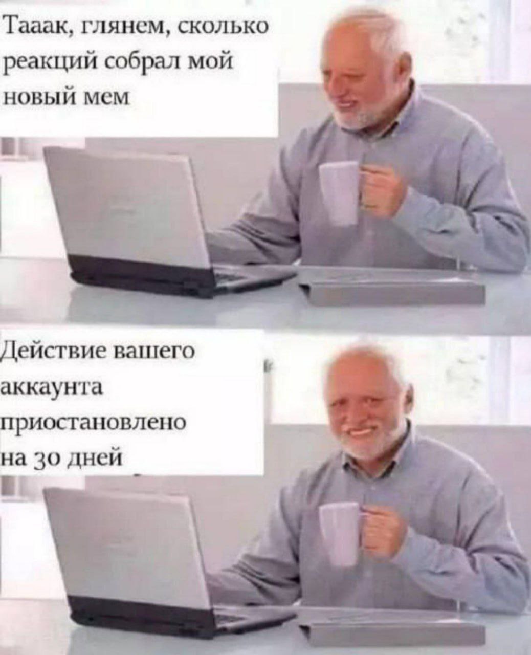 На картинке изображен знаменитый Гарольд, скрывающий боль, сидящий за ноутбуком с кружкой в руке. Сверху надпись "Тааак, глянем, сколько реакций собрал мой новый мем", а снизу "Действие вашего аккаунта приостановлено на 30 дней". Этот мем иронично показывает разочарование человека, который ждал успеха от своего нового творения, но вместо этого столкнулся с блокировкой аккаунта. Надпись на русском языке добавляет юмора к ситуации.
