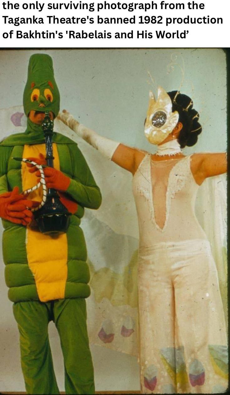 На фотографии изображены два человека в необычных костюмах, напоминающих героев сценической постановки. Мужчина слева одет в зеленый пухлый костюм гусеницы или кузнечика с желтым брюшком и ярко-красными перчатками. На его голове — зеленая маска с большими желтыми глазами, а изо рта торчит что-то похожее на мундштук кальяна, который он держит в руках. Вокруг кальяна обвивается белая змея. Женщина справа одета в светлый облегающий костюм с прозрачными вставками и белыми перчатками, а на ее лице — золотистая маска, напоминающая бабочку или другое насекомое, с большими блестящими глазами и усиками. Она стоит, широко расставив руки, словно танцует или позирует. Фон фотографии светлый и размытый, с еле заметными узорами, что создает впечатление театральной сцены или декораций. Данный кадр является единственной сохранившейся фотографией из запрещенной в 1982 году постановки Театра на Таганке по произведению Бахтина «Рабле и его мир».