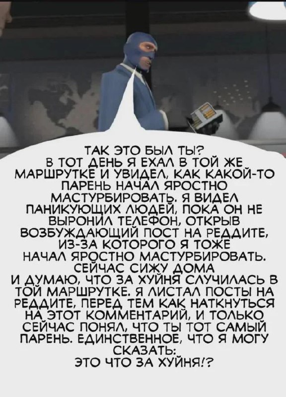 На картинке изображен персонаж Спай из популярной игры Team Fortress 2, выполненный в синей униформе, на нейтральном фоне. Он слегка наклонил голову и смотрит в сторону, будто задает вопрос. Под персонажем находится большое белое облако текста, которое является репликой Спая. В тексте Спай спрашивает: "Так это был ты?". Затем он рассказывает длинную и абсурдную историю о том, как ехал в маршрутке и увидел парня, который начал "яростно мастурбировать" после того, как уронил телефон и открыл "возбуждающий пост на Реддите". Спай признается, что сам начал "яростно мастурбировать" из-за этого. В конце он сидит дома, размышляет о случившемся в маршрутке, листает посты на Реддите, натыкается на комментарий и только тогда понимает, что тот самый парень – это тот, к кому он обращается. Заканчивается реплика вопросом: "Это что за хуйня!?!"