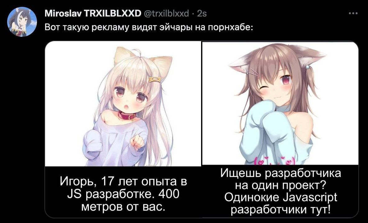На изображении представлен скриншот из Твиттера пользователя Miroslav TRXILBLXXD, на котором изображена "реклама", стилизованная под баннеры "Порнхаба". Сверху подпись: "Вот такую рекламу видят эйчары на порнхабе:". Ниже представлены две картинки с аниме-девушками-кошками. На левой, с милым выражением лица, написано: "Игорь, 17 лет опыта в JS разработке. 400 метров от вас.". На правой, подмигивающей, написано: "Ищешь разработчика на один проект? Одинокие Javascript разработчики тут!". Это юмористический мем, пародирующий типичные объявления о знакомствах или интимных услугах, но в контексте поиска IT-специалистов. На русском языке это звучит как «Вот такую рекламу видят HR-менеджеры на порнхабе».