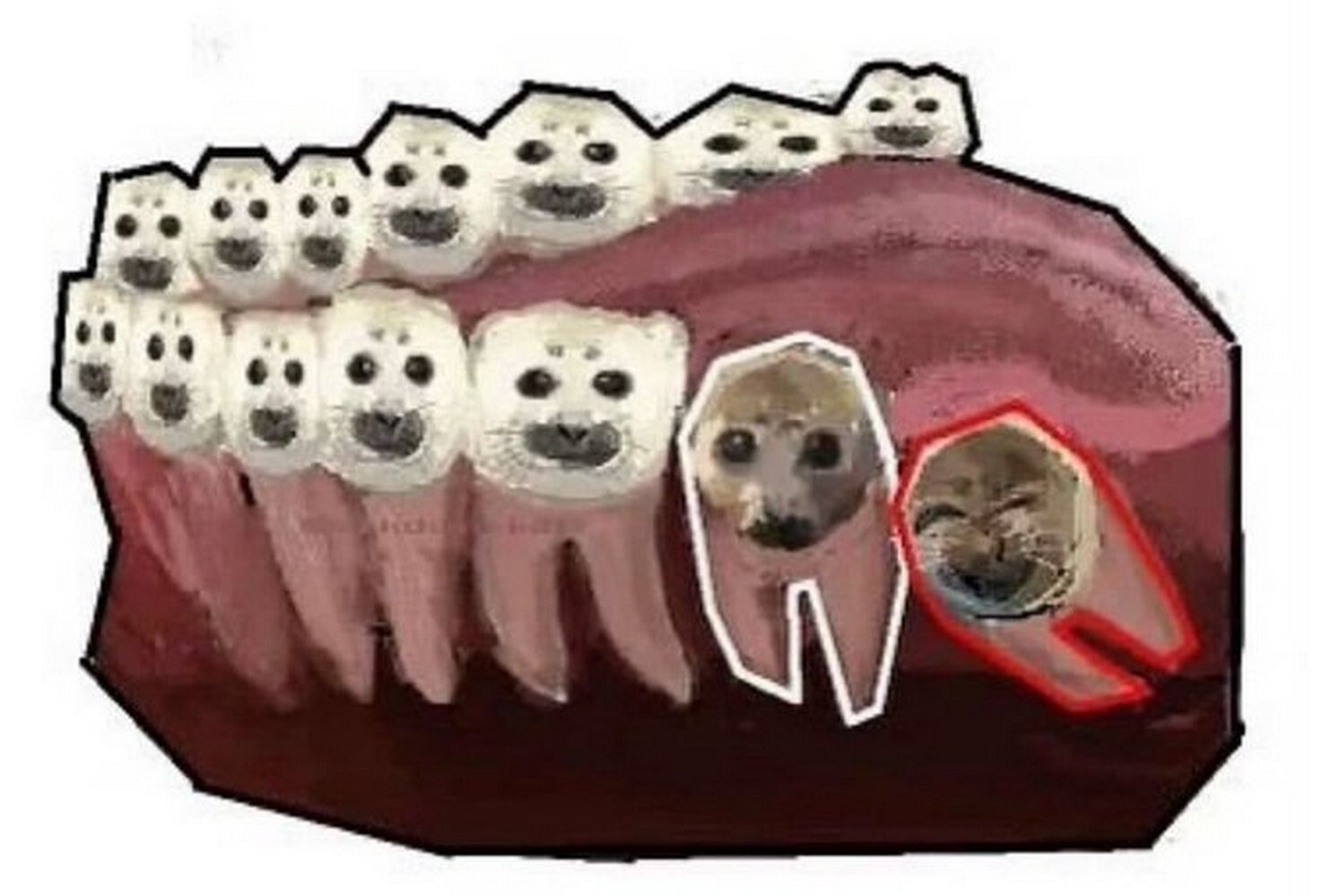На изображении показана челюсть с зубами, которые имеют вид тюленей. Практически все зубы выглядят как головы детенышей тюленей, за исключением двух последних зубов мудрости. Один из них имеет вид тюленя с грустным или обеспокоенным выражением, а самый последний зуб мудрости выглядит как радостный, смеющийся тюлень. Этот мем часто используется для иллюстрации различных ситуаций, где один элемент выделяется из общей массы своим необычным или контрастным состоянием.