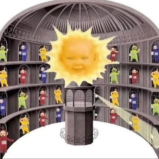 На изображении представлен мрачный серый купол, напоминающий тюрьму или панноптикум. В центре этого сооружения сияет яркое желтое солнце с лицом младенца, точно такое же, как в популярном детском телешоу «Телепузики». По всему периметру купола, на разных уровнях, расположены многочисленные клетки, в каждой из которых находятся по одному Телепузику разных цветов: красному, синему, зеленому и желтому. Они выглядят пойманными и запертыми, а их обычная жизнерадостность кажется замененной безмолвным существованием в этой странной тюрьме.