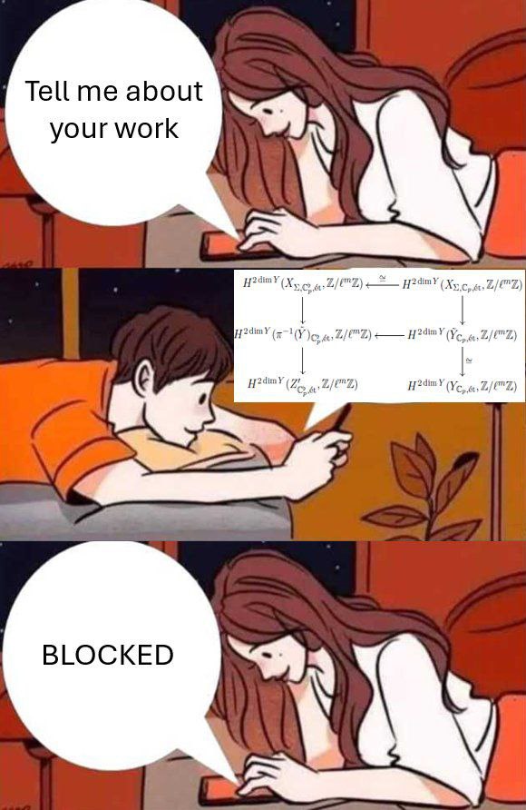Мем состоит из трех панелей. На первой изображена девушка, лежащая на кровати и держащая в руках телефон. Она спрашивает: «Расскажи мне о своей работе». На второй панели показан парень, который, лежа, отвечает ей на сообщение. Он отправляет ей сложные математические формулы. На третьей панели снова изображена девушка, которая отвечает: «Заблокировано». Этот мем часто используется для иллюстрации ситуаций, когда человек слишком сильно углубляется в детали своей работы или хобби, и это отталкивает собеседника.