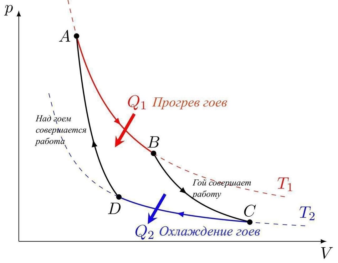 Q1 Прогрев гоев. Над гоем совершается работа. Гой совершает работу. Q2 Охлаждение гоев. T1. T2.