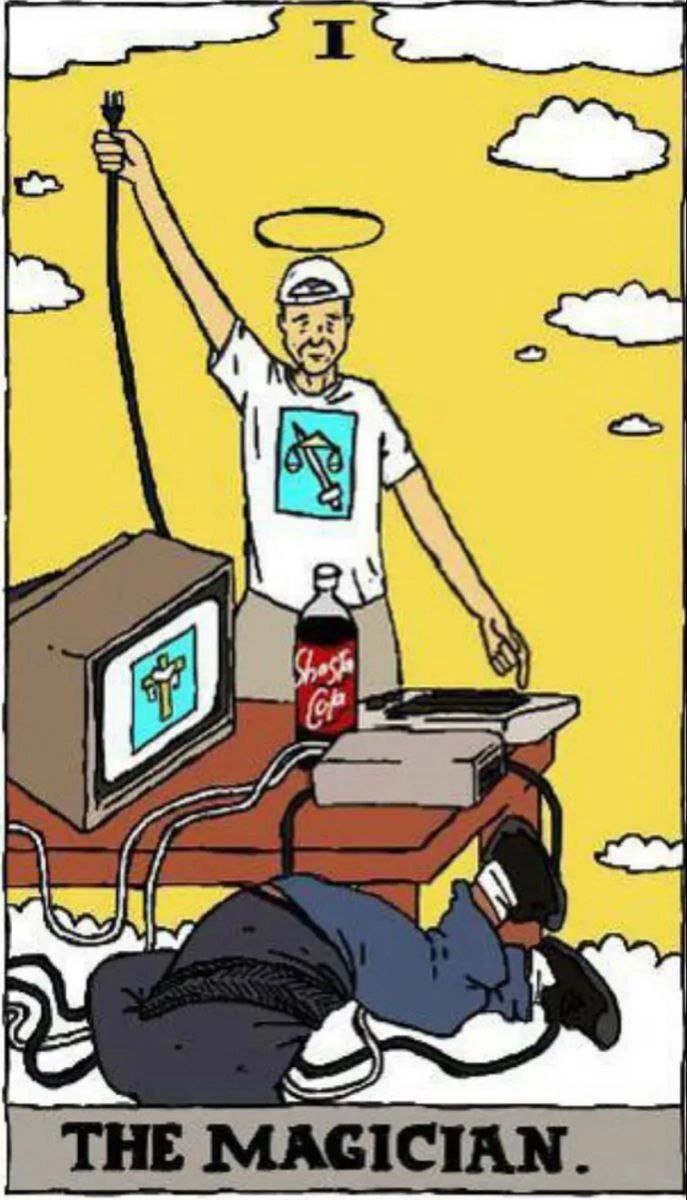 Мем изображает пародию на карту Таро «Маг», где главный герой напоминает известного программиста Терри Дэвиса. На картинке мы видим человека в белой кепке и футболке, держащего в руке электрическую вилку, словно магический жезл. Над его головой парит нимб, а на футболке нарисован символ, напоминающий весы правосудия. Перед ним на столе стоит старый телевизор с тем же символом на экране и бутылка колы с надписью "Shasta Cola". Рядом лежит игровая приставка, и кто-то, возможно, пользователь приставки, лежит под столом, подключенный к ней проводами. Внизу изображения надпись: "THE MAGICIAN". Мем обыгрывает идею магии в современном мире технологий и видеоигр, где простые действия, такие как подключение устройства к сети, могут казаться волшебством. Возможно, это отсылка к геймерам, которые настолько погружены в процесс, что забывают о реальном мире.