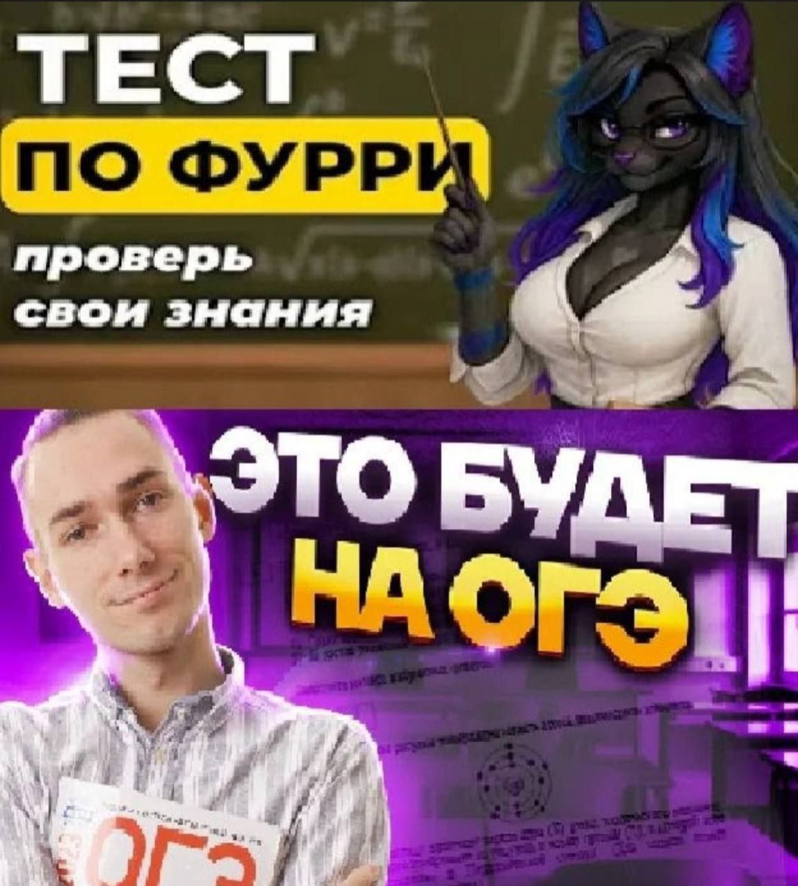 Мем состоит из двух частей. В верхней части изображена фурри-кошка в белой рубашке с декольте, которая указывает указкой на невидимую доску, на которой видны математические формулы. Над ней надпись «Тест по фурри, проверь свои знания». Нижняя часть мема представляет собой изображение молодого человека в рубашке с ОГЭ пособием в руках, который смотрит прямо на зрителя. Надпись над ним гласит: «Это будет на ОГЭ». Весь фон нижней части фиолетовый. Мем сравнивает серьезность подготовки к экзаменам, таким как ОГЭ, с шуточным тестом по знаниям о фурри, намекая на то, что для некоторых людей второе может быть даже важнее или интереснее, чем первое. Это создает комический эффект и подчеркивает контраст между важными образовательными задачами и нишевыми интересами.