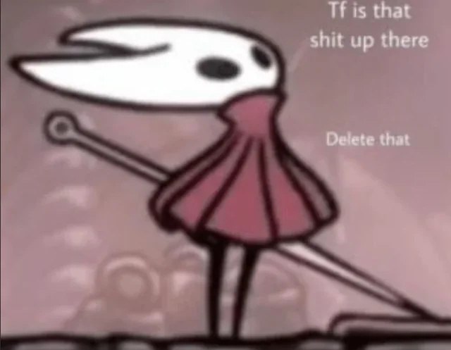 На меме изображен Хорнет из игры Hollow Knight, который стоит на земле и держит в руках свое оружие — иглу. На нем белая маска с двумя черными круглыми глазами и розовое одеяние. Сверху и справа от него находятся надписи на английском языке «Tf is that shit up there» и «Delete that», что переводится как «Что это за хрень там наверху?» и «Удали это». Мем выражает отвращение или недовольство чем-либо, что находится «наверху» или за пределами видимости персонажа.