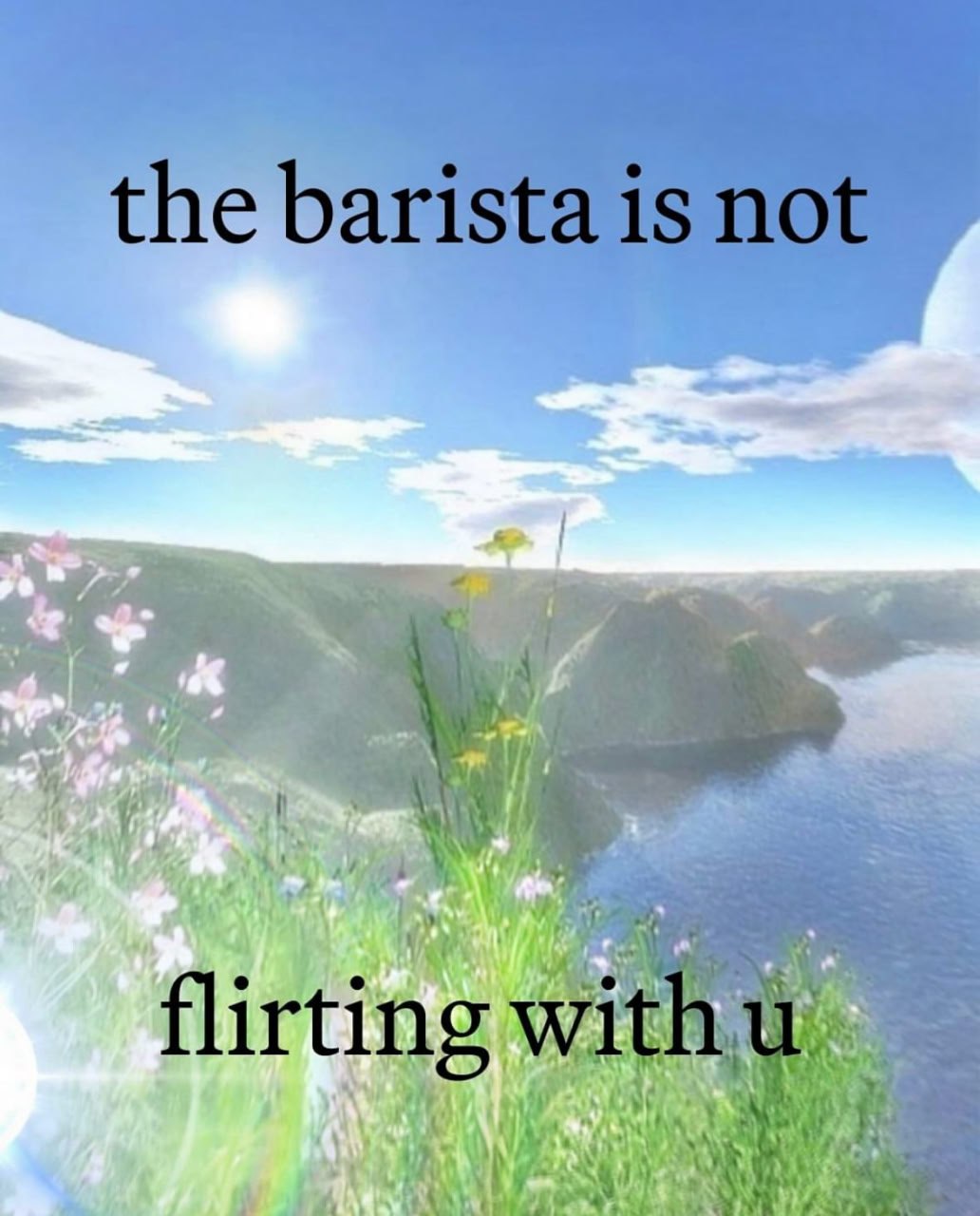 На изображении представлен мем с надписью "The barista is not flirting with u" (Бариста с тобой не флиртует) на фоне живописного пейзажа. Фон мема представляет собой яркое голубое небо с солнцем и редкими облаками. Ниже видны зеленые холмы, покрытые разнообразной растительностью, в том числе цветами с розовыми и желтыми лепестками. В правой части изображения простирается синяя река или озеро, отражающее свет неба. Надпись на меме, выполненная черным шрифтом, расположена в верхней и нижней частях изображения, как бы паря над пейзажем. Мем "Бариста с тобой не флиртует" является популярным способом иронично указать на то, что обычная вежливость или профессионализм могут быть ошибочно приняты за романтический интерес.