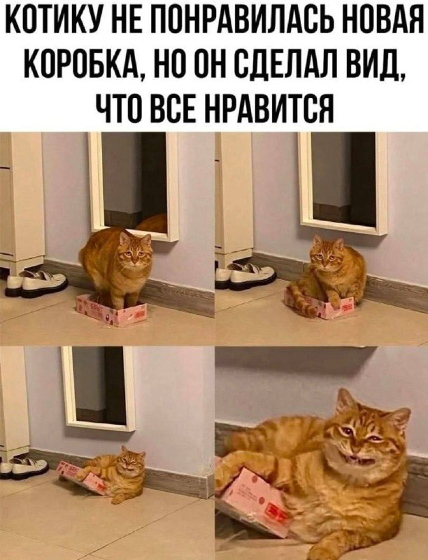 На четырех изображениях показан рыжий кот, который явно пытается притвориться, что ему нравится маленькая розовая коробка. Сначала он сидит в ней, явно некомфортно, потом пытается разместиться в ней лежа, но коробка слишком мала. На последнем кадре кот лежит рядом с коробкой, обняв ее лапами, и на его морде явно читается гримаса недовольства или странной улыбки. На всех кадрах видно, что коробка для кота маловата, но он делает вид, что все в порядке. Задний план представляет собой угол комнаты со стенами светло-серого цвета и белыми плинтусами, а также отражениями в зеркалах и обувью у стен. Создается впечатление, что котик не хочет расстроить хозяина, который подарил ему эту коробку. "Котику не понравилась новая коробка, но он сделал вид, что все нравится" — именно так описывается поведение кота, который старается скрыть свое разочарование.