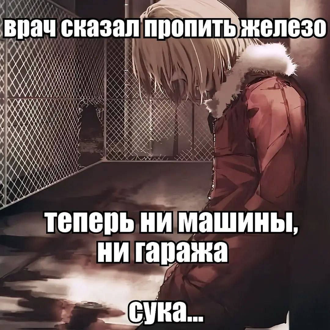На изображении представлен меланхоличный аниме-персонаж, вероятно, мужчина, с опущенной головой и длинными светлыми волосами, одетый в темную куртку с меховым воротником. Он стоит, прислонившись к стене или решетчатому ограждению, на фоне темного, возможно, индустриального пейзажа. Общая атмосфера грустная и задумчивая. Надписи на меме гласят: "врач сказал пропить железо", "теперь ни машины, ни гаража", "сука...". Это шутливый контекст, где фраза "пропить железо" (принять железосодержащие препараты) обыгрывается как буквальное действие, подразумевающее, что герой выпил все железные предметы, включая машину и гараж. Таким образом, у него ничего не осталось, и он находится в отчаянии.
