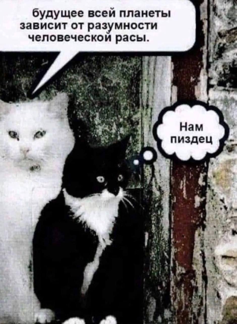 На изображении представлены две кошки, белая и черно-белая. Белая кошка, расположенная на заднем плане слева, выглядит серьезной и "говорит", что "будущее всей планеты зависит от разумности человеческой расы". Черно-белая кошка на переднем плане справа "думает": "Нам пиздец". Этот мем высмеивает пессимистический взгляд на будущее человечества через призму животных, которые "понимают", что люди не справятся с возложенной на них ответственностью. Мем демонстрирует контраст между громким заявлением и прозаической, безысходной реакцией.