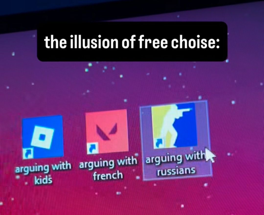 На изображении показан экран компьютера с несколькими иконками, которые предлагают варианты времяпровождения. Подпись сверху гласит: "the illusion of free choise:" что переводится как «иллюзия свободного выбора». Ниже расположены три иконки, каждая из которых подписана: "arguing with kids" (спорить с детьми) с логотипом Roblox, "arguing with french" (спорить с французами) с логотипом Valorant, и "arguing with russians" (спорить с русскими) с логотипом, напоминающим стрелка или биатлониста. Курсор мыши указывает на иконку "arguing with russians", подсвечивая ее. Это показывает, что независимо от выбора, результат будет похожим – споры, что создает ироничную иллюзию выбора. Все это происходит на ярко-фиолетовом фоне, похожем на космическое пространство со звездами.