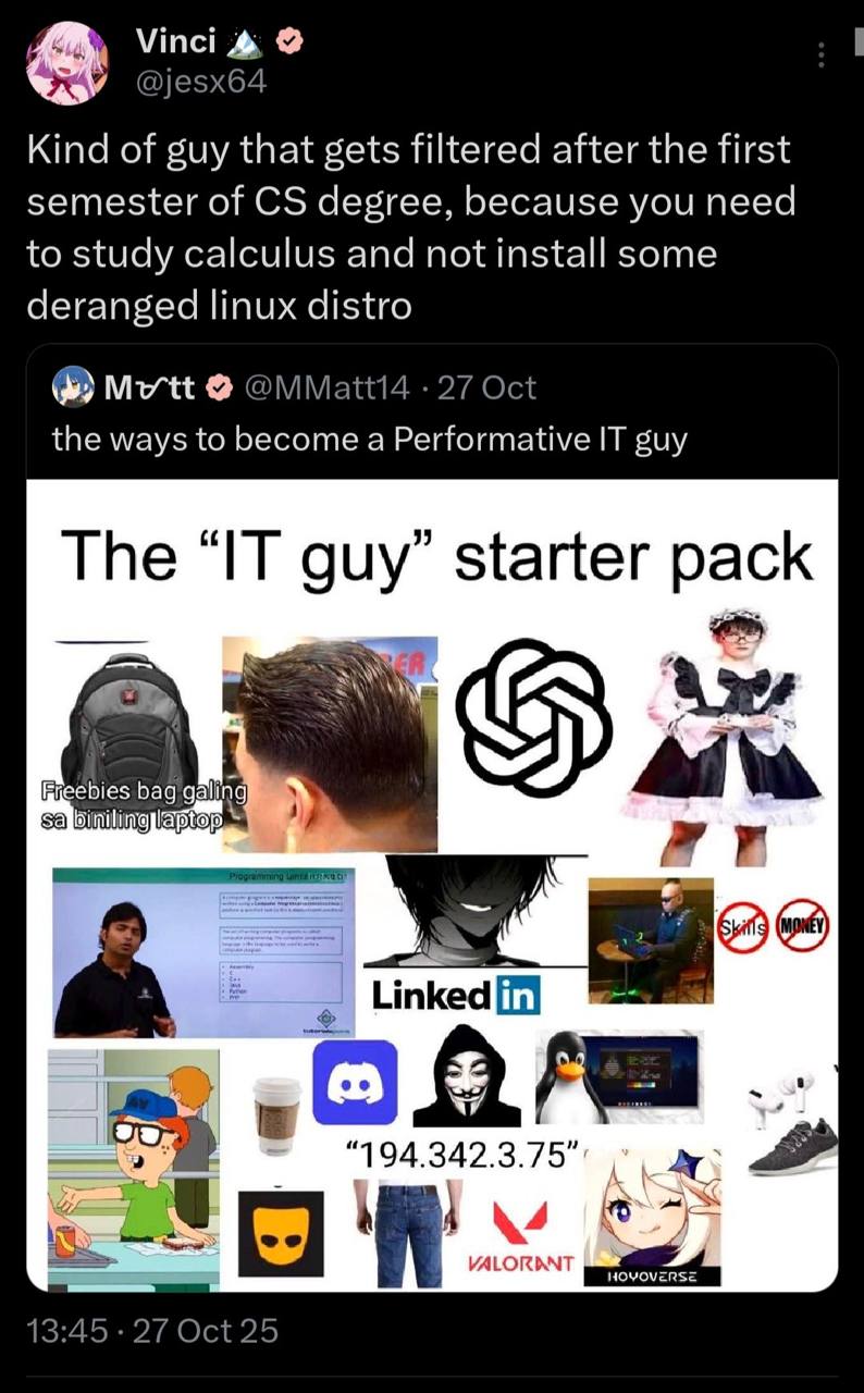 Kind of guy that gets filtered after the first semester of CS degree, because you need to study calculus and not install some deranged linux distro. The ways to become a performative IT guy. The "IT guy" starter pack. Freebies bag galing sa biniling laptop. Linked in. Skills. Money. 194.342.3.75. Valorant. HoYoverse.