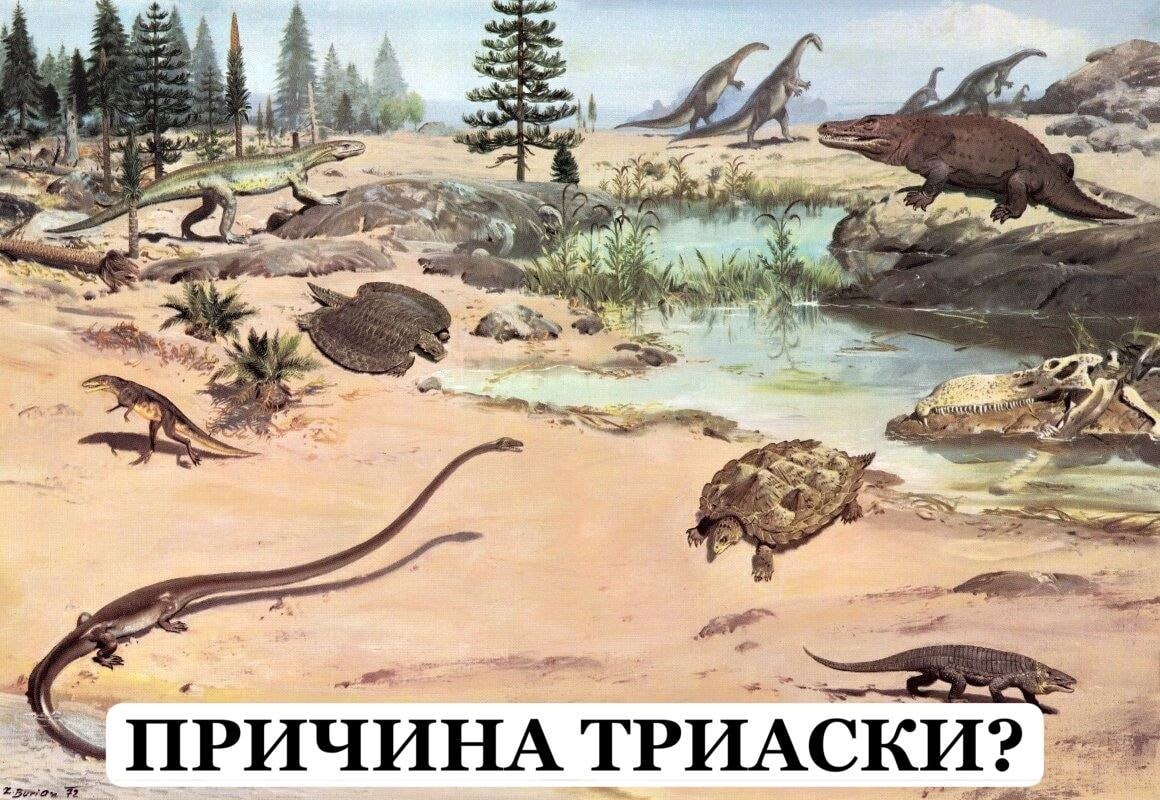 На картинке изображены различные доисторические животные, обитавшие в триасовом периоде, на фоне характерного ландшафта с хвойными деревьями и водоемом. Среди животных можно увидеть различных рептилий, динозавров с длинными шеями, черепах и других существ, включая скелет, лежащий у воды. Надпись на изображении гласит: "Причина триаски?", что вызывает недоумение или любопытство относительно причин чего-либо, связанного с триасовым периодом.