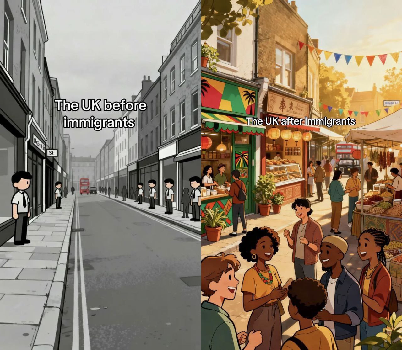 Мем разделён на две части. Левая часть, выполненная в монохромных тонах, изображает Великобританию «до иммигрантов»: пустая улица, по которой едет красный двухэтажный автобус, и лишь несколько одинаково одетых людей в белых рубашках и чёрных брюках стоят вдоль дороги. Справа та же улица показана «после иммигрантов» в ярких красках: она полна людей разных национальностей, которые весело общаются, торгуют на рынке и сидят в кафе. На улице появилось много зелени и разноцветных флажков, что придаёт ей оживлённый и праздничный вид.