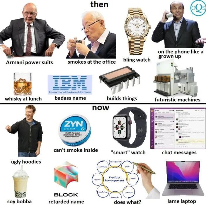 На картинке представлено сравнение «тогда» (then) и «сейчас» (now) в мире бизнеса и технологий. В верхней части показаны мужчины в строгих костюмах, курящие трубки в офисе, пьющие виски на обед и использующие большие машины, что символизирует деловую культуру прошлого. Надписи на английском языке описывают эти элементы: «Armani power suits» (силовые костюмы Armani), «smokes at the office» (курит в офисе), «whisky at lunch» (виски на обед), «badass name» (крутое название, с логотипом IBM), «builds things» (строит вещи) и «futuristic machines» (футуристические машины). Также есть изображение дорогих часов и мужчины, говорящего по телефону «как взрослый» (on the phone like a grown up). В нижней части «сейчас» (now) изображен Марк Цукерберг в худи, что символизирует более расслабленный стиль современных бизнесменов. Также показаны предметы, характерные для настоящего времени: никотиновые пакетики Zyn («can’t smoke inside» – нельзя курить внутри), «умные» часы Apple Watch, чаты с сообщениями («chat messages»), соевый баббл-ти («soy bobba»), абстрактный блок с надписью «retarded name» (отсталое название), диаграмма управления продуктом («Product Management»), а также «отстойный ноутбук» (lame laptop).