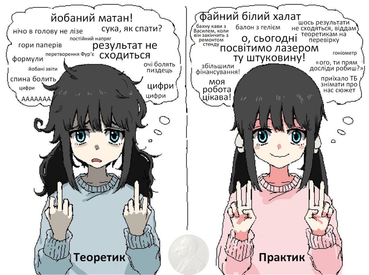 На изображении показаны две девушки-аниме, каждая из которых выражает свои мысли. Девушка слева, подписанная как «Теоретик», выглядит уставшей и подавленной, демонстрируя средние пальцы. Её мысли заполнены негативом: «Йобаний матан!», «Сука, как спати?», «Результат не сходится», «Йобані звіти», «Спина болить», «AAAAAAA», «Очі болять пиздець». Эти фразы отражают тяжесть учебы, несданные отчеты и общее отчаяние от постоянного напряжения и несходящихся результатов. Справа изображена другая девушка, подписанная как «Практик», с улыбкой и показывающая знаки «победы». Её мысли позитивны и полны энтузиазма: «Файний білий халат», «О, сьогодні посвітимо лазером ту штуковину!», «Збільшили фінансування!», «Моя робота цікава!», «Приїхало ТБ знімати про нас сюжет». Она наслаждается своей работой, гордится достижениями, предвкушает эксперименты и новые возможности, демонстрируя явное преимущество практической деятельности над изнурительной теорией.