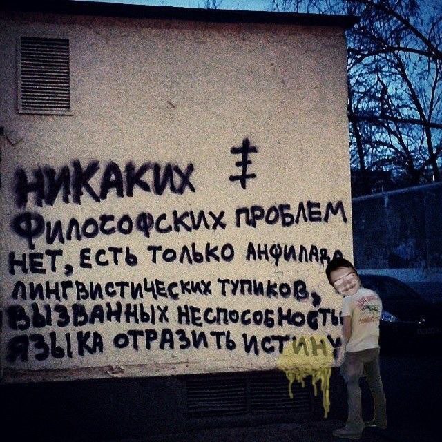 На изображении показан ребенок, стоящий у стены с граффити. Ребенок, чье лицо замазано, повернут к стене и, кажется, писает, оставляя желтые подтеки на стене. На стене также нарисована большая надпись черной краской, которая гласит: "Никаких философских проблем нет, есть только анфилада лингвистических тупиков, вызванных неспособностью языка отразить истину". Это высказывание из книги Людвига Витгенштейна «Логико-философский трактат».