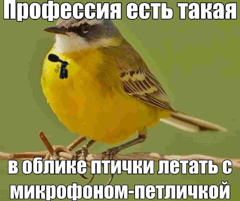 На изображении показана маленькая желтая птичка с серыми и белыми вкраплениями на голове и спине, сидящая на тонкой ветке. На груди у птички, кажется, прикреплен маленький черный микрофон-петличка, что придает ей вид шпиона или репортера. Сверху и снизу на изображении расположен текст, который говорит о существовании такой профессии — летать в облике птички с микрофоном-петличкой. Мем вызывает улыбку, предполагая, что птицы с микрофонами могут быть частью некой секретной службы или просто журналистами, собирающими информацию.