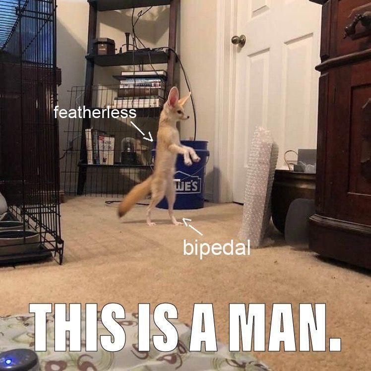 На изображении показан лис фенек, стоящий на задних лапах. К нему прикреплены две стрелки с надписями: «featherless» (без перьев) и «bipedal» (двуногий). Ниже размещён крупный текст «THIS IS A MAN.» (Это человек). Этот мем иронично отсылает к знаменитому определению человека Платоном как «двуногого существа без перьев». Фенек, будучи без перьев и стоя на двух лапах, идеально подходит под это определение, что вызывает комический эффект.