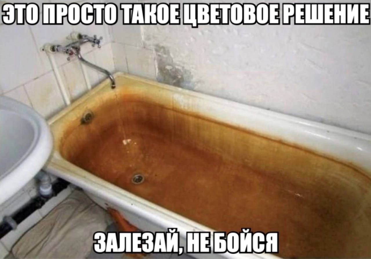 На изображении показана очень грязная ванна с желто-коричневым налетом ржавчины и грязной водой, которая продолжает течь из крана. Плитка вокруг ванны тоже выглядит старой и местами обшарпанной, с потеками. На картинке сверху надпись «Это просто такое цветовое решение» (Это просто такое цветовое решение), а снизу — «Залезай, не бойся» (Залезай, не бойся). Этот мем используется для иронического комментария к чему-либо, что выглядит отталкивающе или некачественно, но при этом выдается за норму или даже за некое дизайнерское решение. Он подчеркивает абсурдность попыток оправдать очевидные недостатки.
