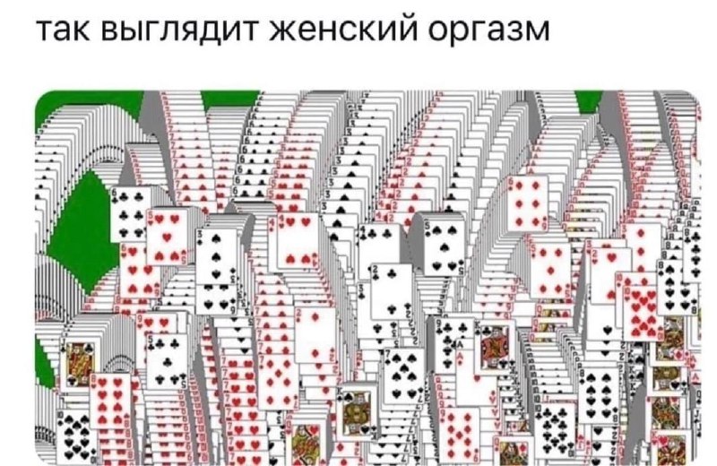 На картинке изображен скриншот знаменитой карточной игры «Косынка», или Solitaire, в момент её завершения, когда все карты автоматически раскладываются по стопкам. Этот процесс выглядит как красивый каскад из многих карт, быстро падающих друг за другом, создавая визуально приятное зрелище. Сверху над изображением расположена надпись, которая сравнивает этот эффект с женским оргазмом, подразумевая его сложность, непредсказуемость и в то же время невероятную кульминацию, как и завершение сложной партии в «Косынку» со всеми её автоматическими раскладками. Смысл этой картинки заключается в том, что женский оргазм так же сложен, запутан и многогранен, как и пасьянс «Косынка» до самого конца, а после достижения цели он может быть таким же красивым и неожиданным, как и автоматическое разложение карт по стопкам. Или это просто забавная аналогия, которая вызывает улыбку и отсылает к знакомой многим ситуации из игры.