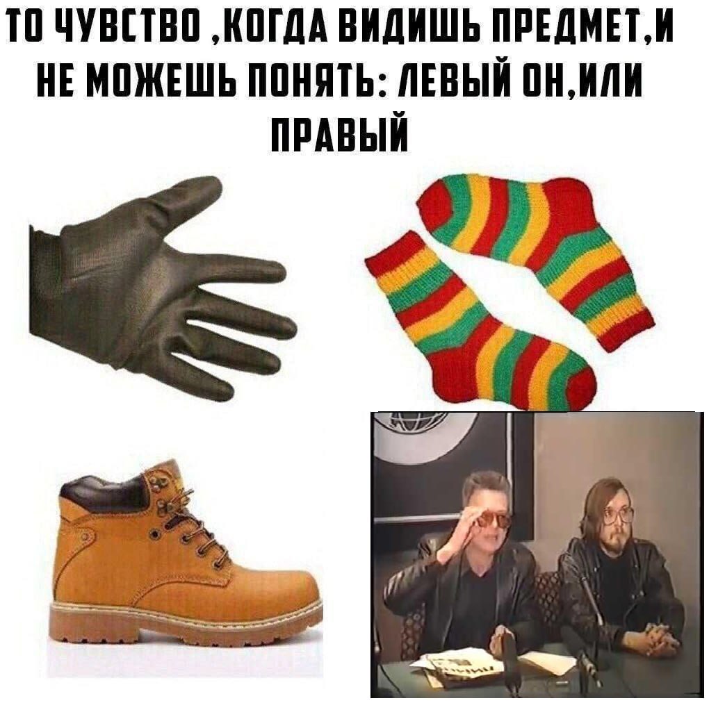 Мем состоит из четырех изображений: в левом верхнем углу — черная перчатка, в правом верхнем — два разноцветных носка (красный, желтый, зеленый), в левом нижнем — один желтый ботинок, и в правом нижнем углу — два мужчины за столом, один из них в темных очках, другой в обычных. Сверху над ними черными буквами написано «То чувство, когда видишь предмет, и не можешь понять: левый он, или правый». Этот мем выражает знакомое многим чувство растерянности, когда сталкиваешься с вещами, для которых не очевидно, к какой паре (левой или правой) они относятся. Перчатка, носки и ботинок — классические примеры таких предметов, которые могут поставить в тупик, если нет явных признаков. Реакция мужчин внизу демонстрирует, насколько это может быть запутанной ситуацией.