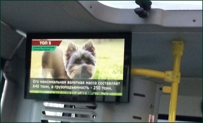 На фотографии изображен экран, установленный в салоне общественного транспорта, вероятно, автобуса или троллейбуса. На экране демонстрируется сюжет, озаглавленный «ТОП 5. Самые маленькие породы собак», и на нем виден милый щенок йоркширского терьера или другой декоративной породы. Однако под изображением собаки на экране появилась неожиданная подпись, которая гласит: "Его максимальная взлетная масса составляет 640 тонн, а грузоподъемность - 250 тонн". Этот забавный коллапс информации создает комический эффект: описание, очевидно, предназначенное для какого-то летательного аппарата или крупной техники, ошибочно наложилось на изображение миниатюрной собачки, делая ее невероятно мощным "транспортным средством".