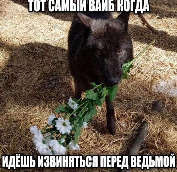 На этом меме изображен черный волк, который держит в зубах небольшой букет белых цветов. Он стоит на сухой траве или сене, и выглядит немного виноватым или смущенным. Солнечный свет падает на землю, создавая тени. Надпись на меме гласит: "Тот самый вайб, когда идешь извиняться перед ведьмой". Этот мем передает чувство, когда человек вынужден просить прощения у кого-то могущественного или "страшного", как "ведьма", и пытается смягчить ее гнев при помощи даров, как этот волк с букетом цветов.