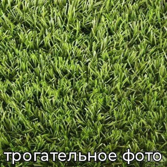 На изображении крупным планом показана поверхность искусственного газона, состоящая из множества зеленых ворсинок, имитирующих траву. Ворсинки плотно расположены друг к другу, создавая однородную текстуру. В нижней части фотографии белыми буквами напечатан текст: «трогательное фото».