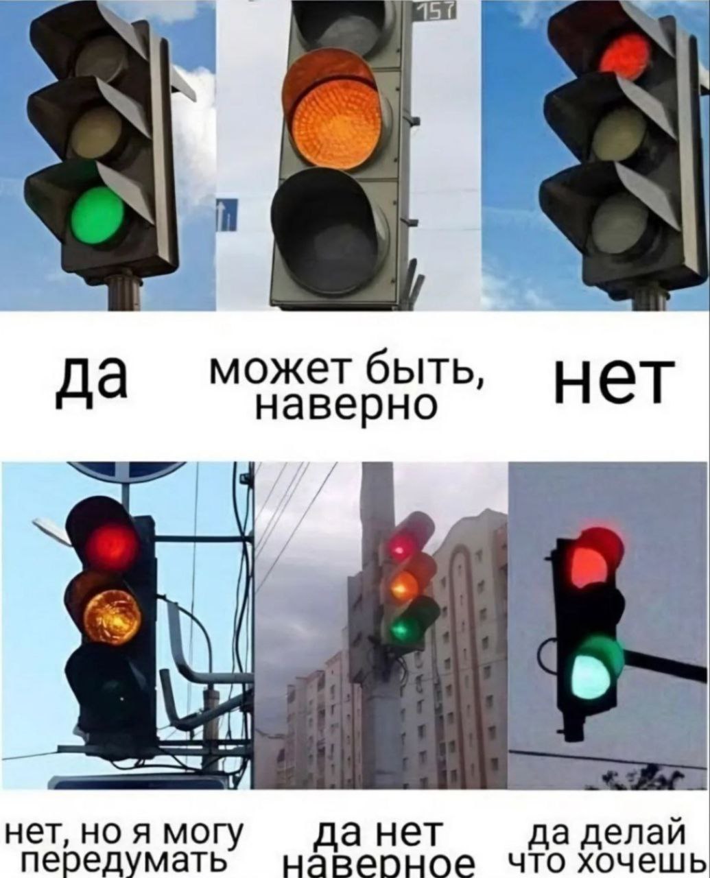 На изображении показано шесть разных светофоров, каждый из которых соответствует определенному ответу на вопрос. В верхнем ряду слева направо: зеленый свет ("да"), желтый свет ("может быть, наверное"), красный свет ("нет"). В нижнем ряду слева направо: красный и желтый свет одновременно ("нет, но я могу передумать"), все три света горят ("да нет наверное"), и красный с зеленым одновременно ("да делай что хочешь"). Этот мем иллюстрирует различные степени неопределенности или противоречивости в ответах, используя понятные сигналы светофора.