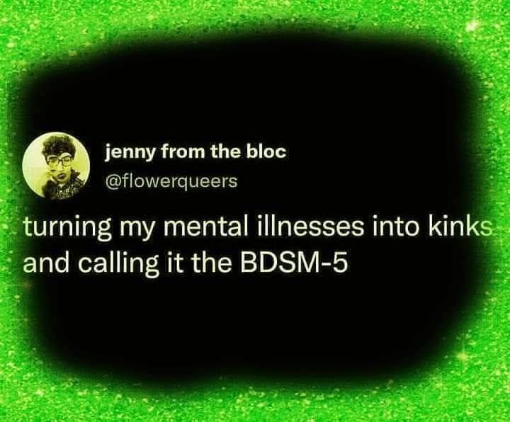 На изображении представлен скриншот твита от пользователя @flowerqueers, известного как "jenny from the bloc". Твит содержит фразу: "turning my mental illnesses into kinks and calling it the BDSM-5", что переводится как "превращаю свои психические расстройства в фетиши и называю это БДСМ-5". Этот мем является игрой слов, отсылающей к Диагностическому и статистическому руководству по психическим расстройствам, пятое издание (DSM-5), и юмористически обыгрывает идею принятия и переосмысления личных проблем.