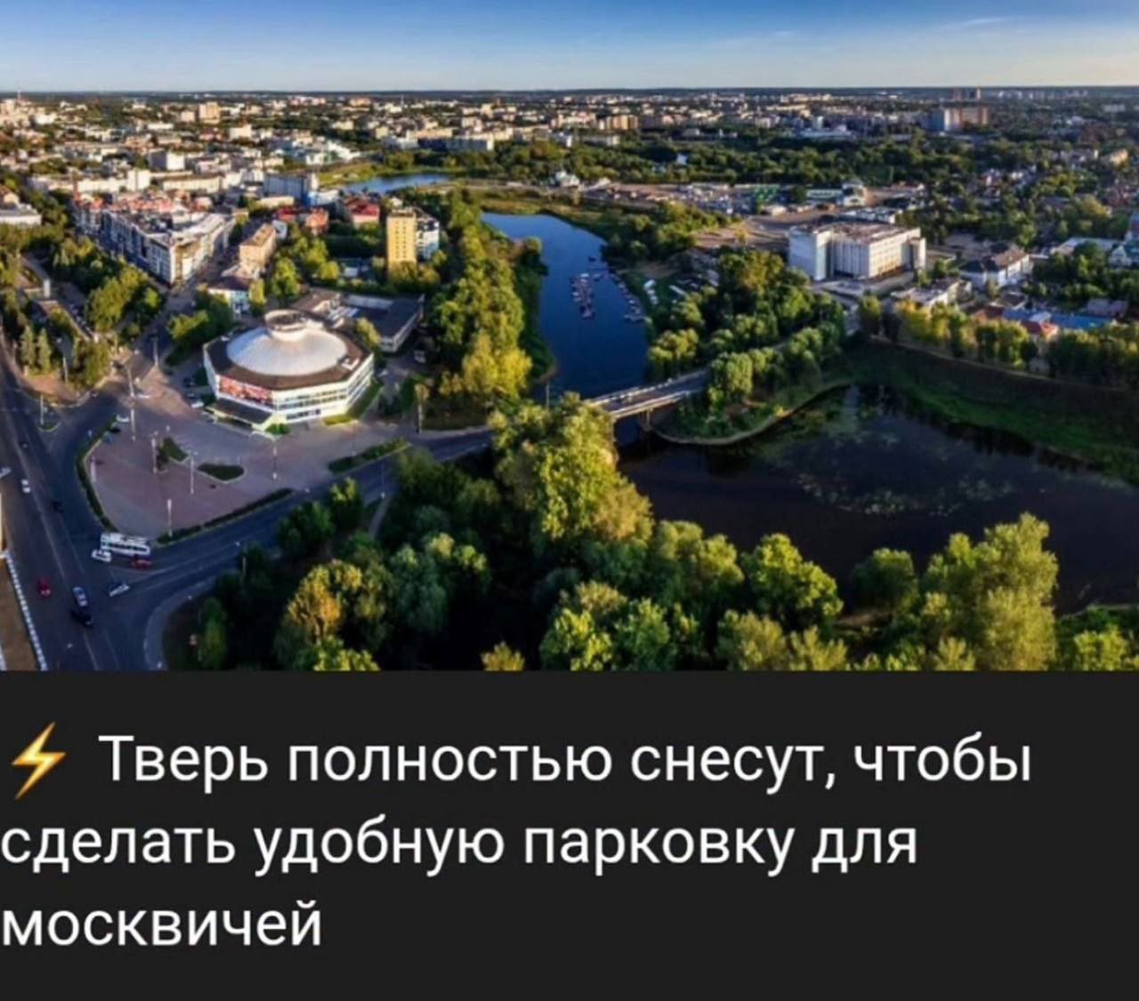 На изображении представлен вид с высоты птичьего полета на город Тверь. Видно реку, мосты, множество зелени и городскую застройку. В центре кадра выделяется круглое здание цирка. Нижняя часть изображения содержит текст, который сообщает, что «Тверь полностью снесут, чтобы сделать удобную парковку для москвичей». Этот текст является шутливым комментарием, пародирующим отношение к региональным городам в пользу столицы, и вызывает ироничное отношение к предполагаемым планам по развитию инфраструктуры.