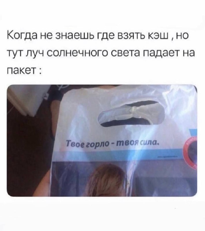 Мем "Твое горло - твоя сила" - это изображение, на котором сверху располагается фраза: "Когда не знаешь где взять кэш , но тут луч солнечного света падает на пакет :". Под этой фразой расположена часть белого полупрозрачного пакета, на который падает луч света, открывая надпись: "Твое горло - твоя сила.". Этот мем юмористически обыгрывает ситуацию, когда человек ищет деньги или кэш, и внезапно находит "подсказку" или "решение" в виде надписи на пакете. Фраза "Твое горло - твоя сила" воспринимается как комичный намек на возможность заработка через использование голоса или "горла", например, пением или иным способом, который требует голосовых данных. Забавное сочетание безысходности и неожиданного "озарения" делает этот мем актуальным для ситуаций, когда люди ищут креативные или необычные способы решения финансовых проблем.