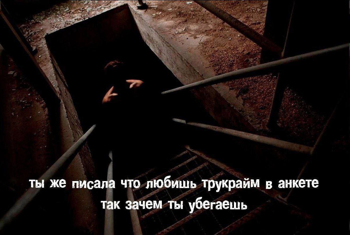 На изображении показан темный и, возможно, заброшенный подвал или шахта, спускающаяся вниз по старой ржавой лестнице. В глубине, на тёмном фоне, виднеется нечёткий силуэт человека, который, кажется, спускается или уже находится внизу. Обстановка выглядит довольно мрачно и таинственно. Внизу мема наложена надпись белым шрифтом, которая является основным акцентом и источником юмора. Надпись на меме "Ты же писала что любишь трукрайм в анкете так зачем ты убегаешь" (перевод: "Ты же писала, что любишь трукрайм в анкете, так зачем ты убегаешь") создаёт комический эффект, играя на контрасте между заявленным интересом к жанру трукрайм (true crime) и, предположительно, испуганной реакцией на реальную угрозу или таинственную ситуацию, которая могла бы быть частью такого сюжета. Этот мем высмеивает тех, кто притворяется смелым любителем острых ощущений, но на деле не готов столкнуться с ними в реальной жизни.