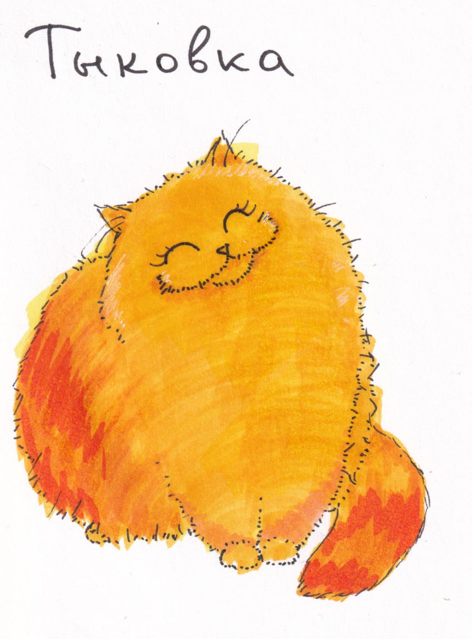 На изображении нарисована очень милая, пушистая, оранжевая кошечка, которая сидит, свернувшись калачиком, и улыбается с закрытыми глазами. У кошечки есть маленький хвостик, раскрашенный в оранжевые и красные оттенки. Над кошечкой сверху от руки написано черным цветом слово «Тыковка». Это очень добрый и позитивный рисунок, выполненный в стиле детской иллюстрации. Фон изображения белый, что делает кошечку еще более заметной и яркой. Детализация шерсти выполнена черными пунктирными линиями, создавая эффект пушистости.