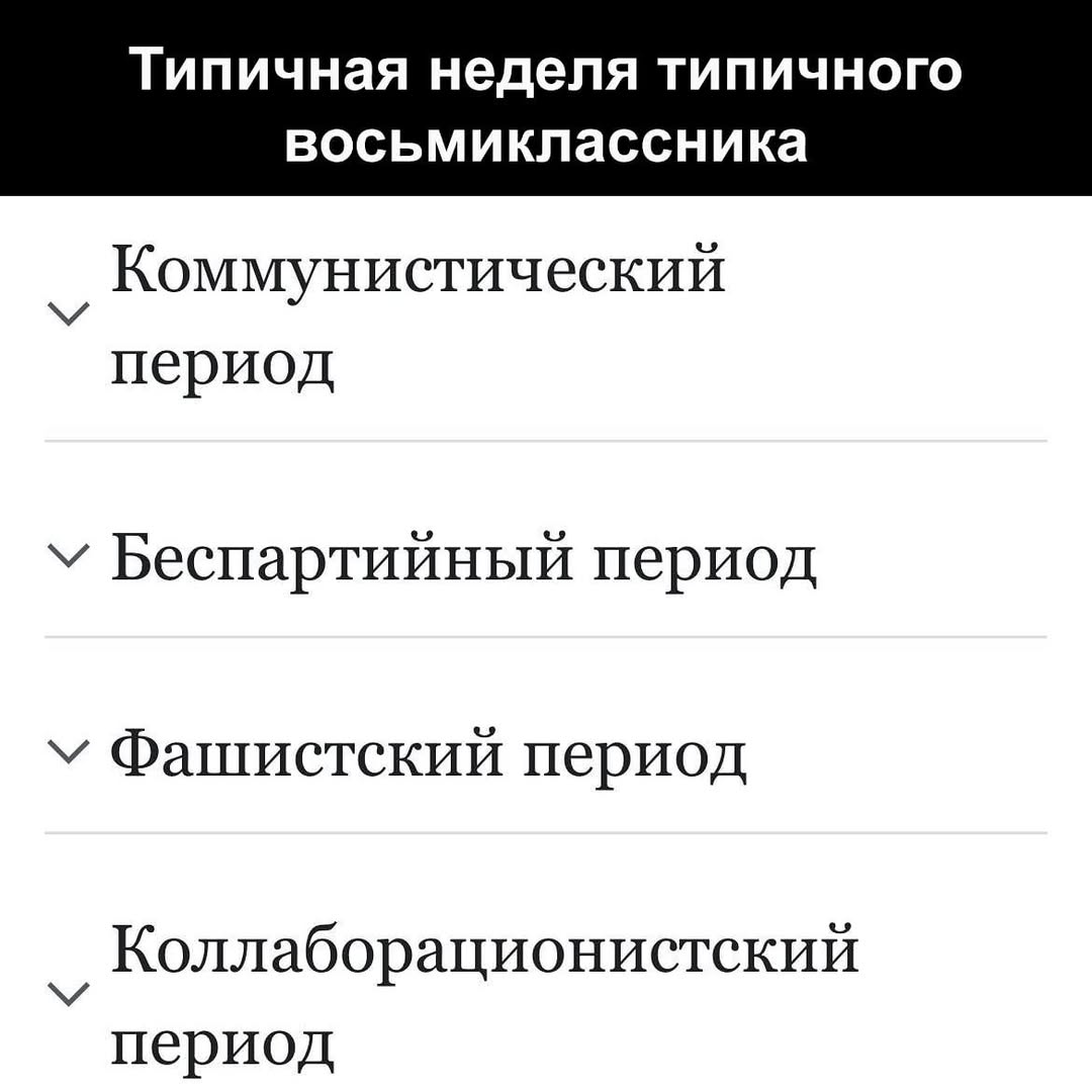 На изображении показан список из четырех пунктов, которые озаглавлены как «Типичная неделя типичного восьмиклассника». Под заголовком идут пункты: «Коммунистический период», «Беспартийный период», «Фашистский период» и «Коллаборационистский период». Вероятно, мем высмеивает нестабильность взглядов и убеждений подростков в этом возрасте, их склонность к быстрым сменам мнений и интересов, а также юношеский максимализм. Возможно, это шутка над неопределенностью или «идеологическими метаниями» школьников.