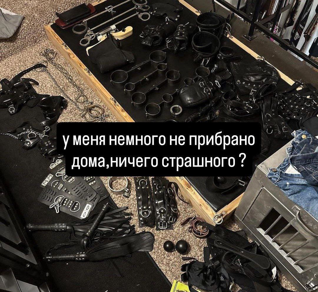 На изображении показан, на первый взгляд, беспорядок в комнате, где на полу и на столике разложены различные БДСМ-аксессуары: наручники, плётки, ошейники, маски, кляпы и другие приспособления для ролевых игр. Все предметы выполнены преимущественно из чёрной кожи и металла. Поверх изображения наложена надпись на русском языке: "У меня немного не прибрано дома, ничего страшного?", которая иронично контрастирует с содержимым комнаты, подразумевая, что "неприбранность" здесь совсем не главное.
