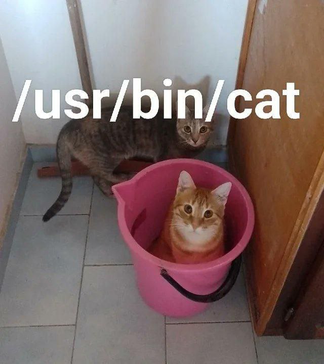 На изображении показаны две кошки в углу комнаты. Одна кошка, полосатая, стоит на полу и смотрит прямо на зрителя. Другая кошка, рыжего окраса, сидит в ярко-розовом ведре. Ее голова и верхняя часть туловища выглядывают из ведра, и она также смотрит прямо на зрителя. На переднем плане, поверх изображения, белыми буквами напечатан текст: «/usr/bin/cat», который является отсылкой к команде Unix/Linux для вывода содержимого файлов, а также к названию животного. Пол в комнате выложен серой плиткой.