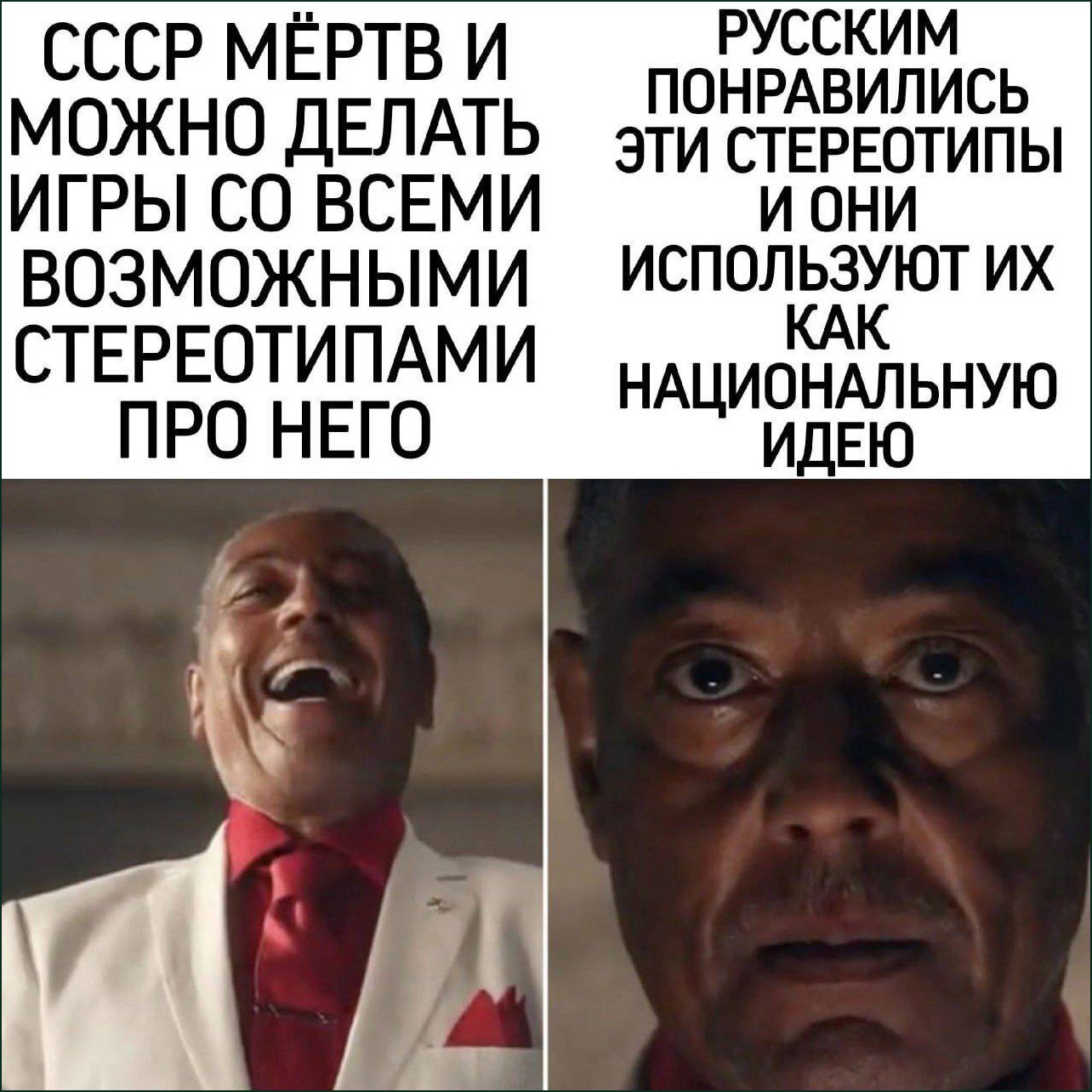 Мем разделён на две части. В верхней части экрана расположен текст, а в нижней части — кадры с актёром Джанкарло Эспозито. Слева изображён смеющийся Густаво Фринг в белом пиджаке и красной рубашке, который олицетворяет сарказм и притворное веселье. Справа его лицо выражает шок и недоумение. Этот мем иллюстрирует, как русские восприняли стереотипы о СССР и сделали их частью своей национальной идеи, что вызывает смех и удивление одновременно. Мем передаёт иронию по поводу использования клише, связанных с прошлым.