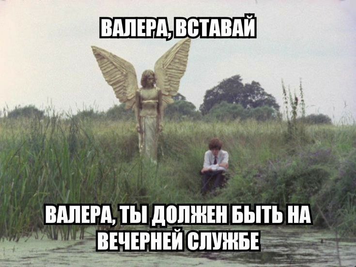 На изображении показан пейзаж с болотистой местностью, высокой травой и деревьями на заднем плане. В центре кадра стоит большая золотистая статуя ангела с распростертыми крыльями, напоминающая традиционное церковное изваяние. Немного правее и чуть позади ангела, сидит молодой человек в рубашке и галстуке, видимо, погруженный в свои мысли или просто отдыхающий. Надпись на меме, "Валера, вставай, Валера, ты должен быть на вечерней службе", создает забавный контраст между серьезным видом ангела, который словно призывает Валеру к религиозному долгу, и умиротворенным или, возможно, уставшим состоянием сидящего человека. Этот мем часто используется для ситуаций, когда кого-то призывают к важным обязанностям или делам, но он предпочитает оставаться в покое.