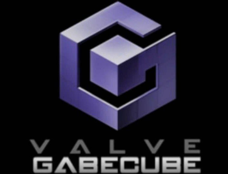 На изображении представлен логотип, который является гибридом двух известных игровых компаний: Nintendo GameCube и Valve. Верхняя часть логотипа — это классический логотип Nintendo GameCube, представляющий собой стилизованный куб фиолетового цвета с серебристыми гранями на черном фоне. В нижней части под кубом расположены слова "VALVE" и "GABECUBE", написанные шрифтом, характерным для логотипа Valve. Это создает забавное слияние, которое можно трактовать как шутку о возможном сотрудничестве или кроссовере между этими игровыми гигантами, или же отсылку к Гейбу Ньюэллу, главе Valve, и его ассоциации с числом 3.