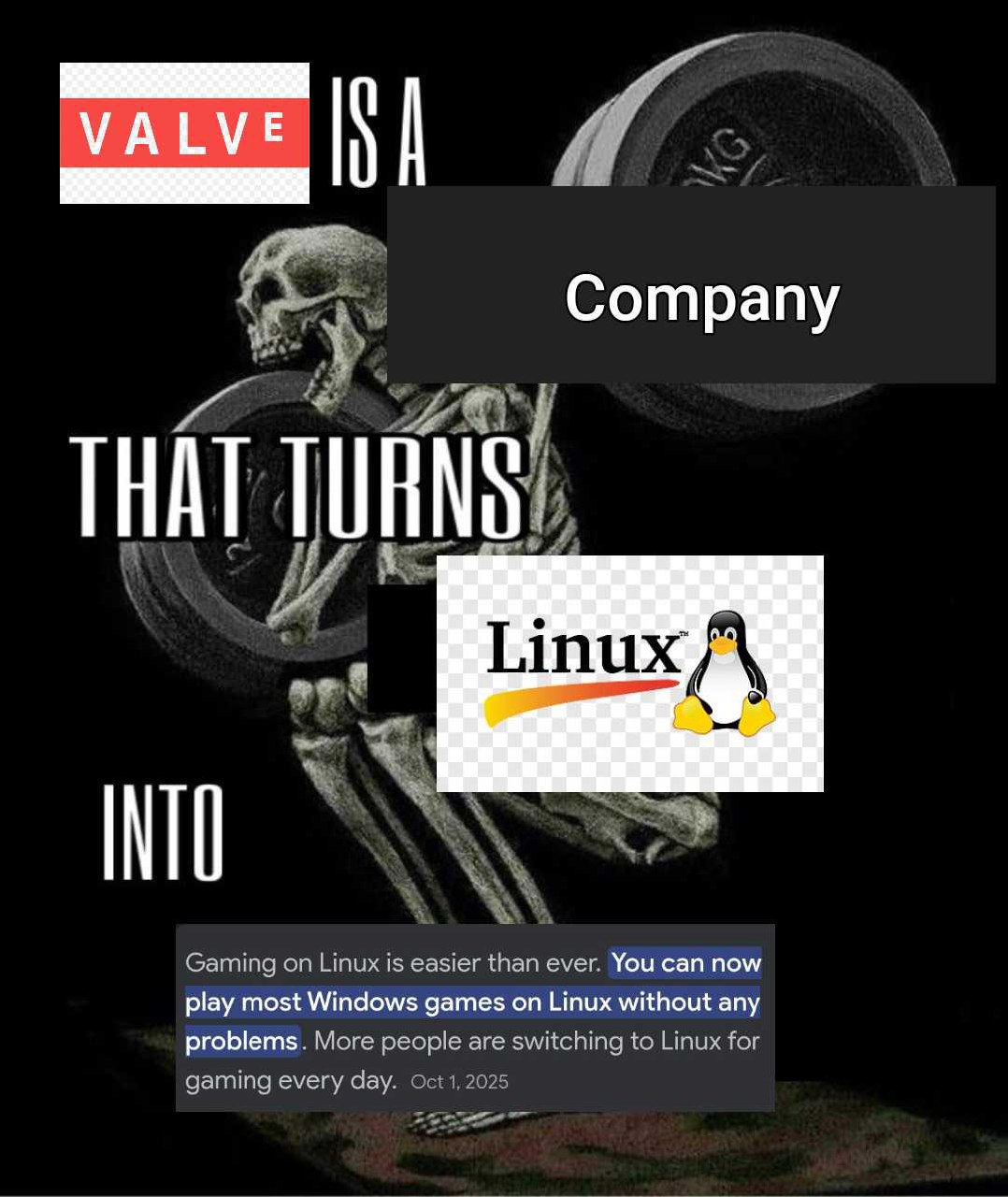 На изображении представлен мем с черепом, который поднимает штангу, символизируя усердную работу. Поверх черепа и штанги наложены текстовые блоки и логотипы. В верхней части мема виден логотип Valve, затем слова «IS A», а рядом с ним — надпись «Company». Ниже надпись «THAT TURNS» и логотип Linux с пингвином. Еще ниже надпись «INTO». В самом низу мема расположен текстовый блок, в котором говорится, что «Gaming on Linux is easier than ever. You can now play most Windows games on Linux without any problems. More people are switching to Linux for gaming every day. Oct 1, 2025» (Играть на Linux стало проще, чем когда-либо. Теперь вы можете играть в большинство игр Windows на Linux без каких-либо проблем. Все больше людей переходят на Linux для игр каждый день. 1 октября 2025 г.). Мем намекает на то, как компания Valve способствует развитию игрового процесса на Linux, делая его более доступным и популярным.
