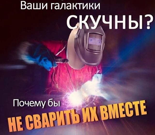 На изображении показан сварщик в рабочей форме и маске, который выполняет сварочные работы, создавая яркие искры и вспышки света. Надпись на меме, словно реклама чего-то необычного, предлагает решить проблему скучных галактик: "Ваши галактики скучны? Почему бы не сварить их вместе". Эта фраза вызывает улыбку, так как объединяет космические масштабы с обыденным, но очень сильным и созидательным действием – сваркой.