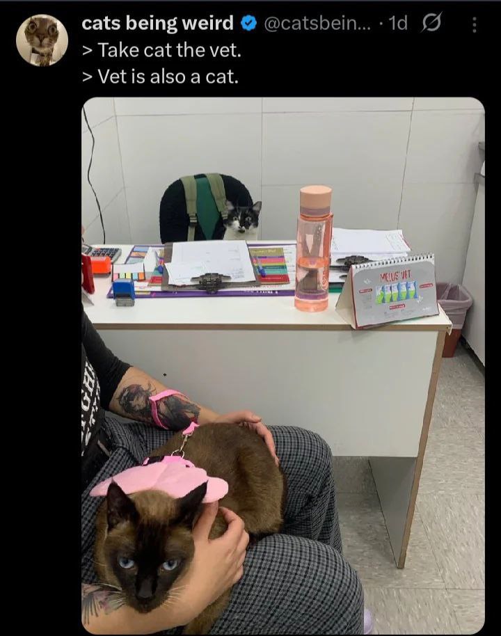 На изображении показан скриншот из Твиттера, где пользователь опубликовал фотографию из ветеринарной клиники. На переднем плане сидит человек, на коленях у которого находится кот с голубыми глазами и в розовой шлейке. Он смотрит прямо в камеру. За столом ветеринара, на стуле, выглядывает черно-белый кот, который является ветеринаром. На столе разложены различные бумаги, канцелярские принадлежности, бутылка с водой и календарь. Суть мема в том, что кот привезли к ветеринару, а ветеринар сам оказался котом. Эта забавная ситуация подчеркивает комичность происходящего и вызывает улыбку, ведь кому, как не коту, лучше всех знать, что нужно другому коту?