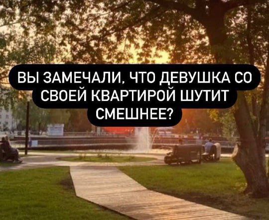На изображении представлен парк вечером или на закате. Виден фонтан, деревья с зеленой листвой и несколько скамеек, на которых сидят люди. Дорожка из деревянных досок уходит вдаль. В центре изображения черная плашка с белым текстом, который гласит: "Вы замечали, что девушка со своей квартирой шутит смешнее?", что переводится как: "Вы замечали, что девушка со своей квартирой шутит смешнее?".